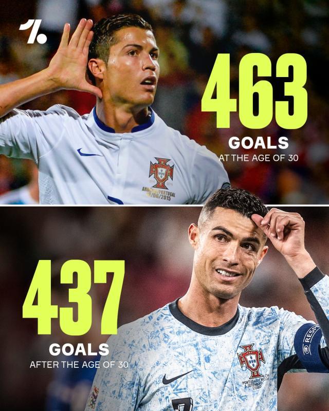 C罗在30岁以前打进了463球,30岁后至今打进437球。